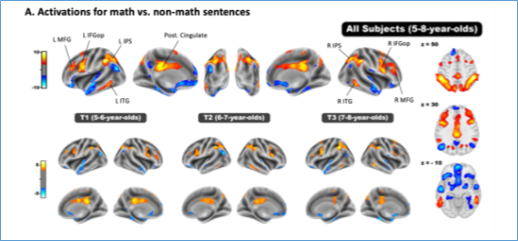 Pour répondre à cette question, nous avons mené une étude longitudinale en IRM fonctionnelle auprès d’une large cohorte d’enfants suivies de la grande section de maternelle au CP et CE1 – une période clé du développement cognitif et scolaire. Nous avons examiné l’évolution des réponses cérébrales lors du traitement de phrases mathématiques (par ex., cinq est entre sept et douze) et de phrases non-mathématiques (par ex., la fourmi est un insecte noir).