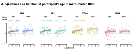 Figure 2. Développement du réseau cérébral mathématique. Dans chaque région, nous avons calculé la valeur moyenne de chaque participant pour chaque condition, à chaque fois qu’il ou elle a effectué une IRMf (T1, T2 ou T3). Afin de comparer les trajectoires développementales propres aux mathématiques, nous avons calculé les différences d’activations entre les phrases mathématiques et les phrases non-mathématiques.