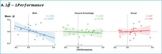 Figure 3. Un encodage plus efficace de l’information lorsqu’elle est mieux comprise. Seuls les enfants ayant participé aux deux séances d’IRM à T1 et à T3 ont été inclus dans ces analyses. Pour chaque et chaque phrase, nous avons calculé le changement dans l’activation cérébrale en soustrayant les valeurs d’activations à T3 de celles à T1, dans les régions liées aux mathématiques. Pour chaque phrase, nous avons également calculé la performance comportementale moyenne de tous les enfants à T1 et à T3 et utilisé la différence comme indicateur du changement de compréhension.