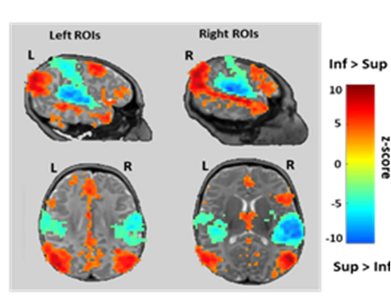 En analysant des données d’IRM fonctionnelle de 116 nouveaux-nés nous avons observé que le STS est déjà organisé en sous-régions spécialisées dès la naissance. En effet, les parties supérieures et inférieures du sillon ne sont pas connectées aux mêmes aires du cerveau.